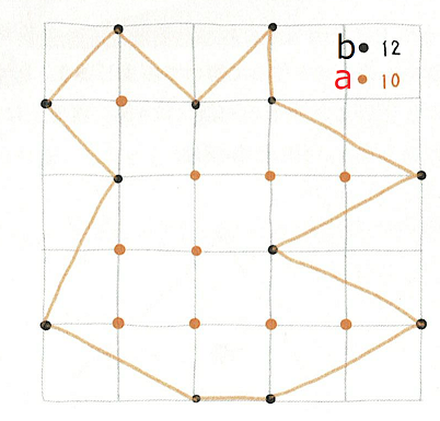 多角形の内部にある格子点の個数をa, 境界上にある格子点の個数をbとすると面積Sは